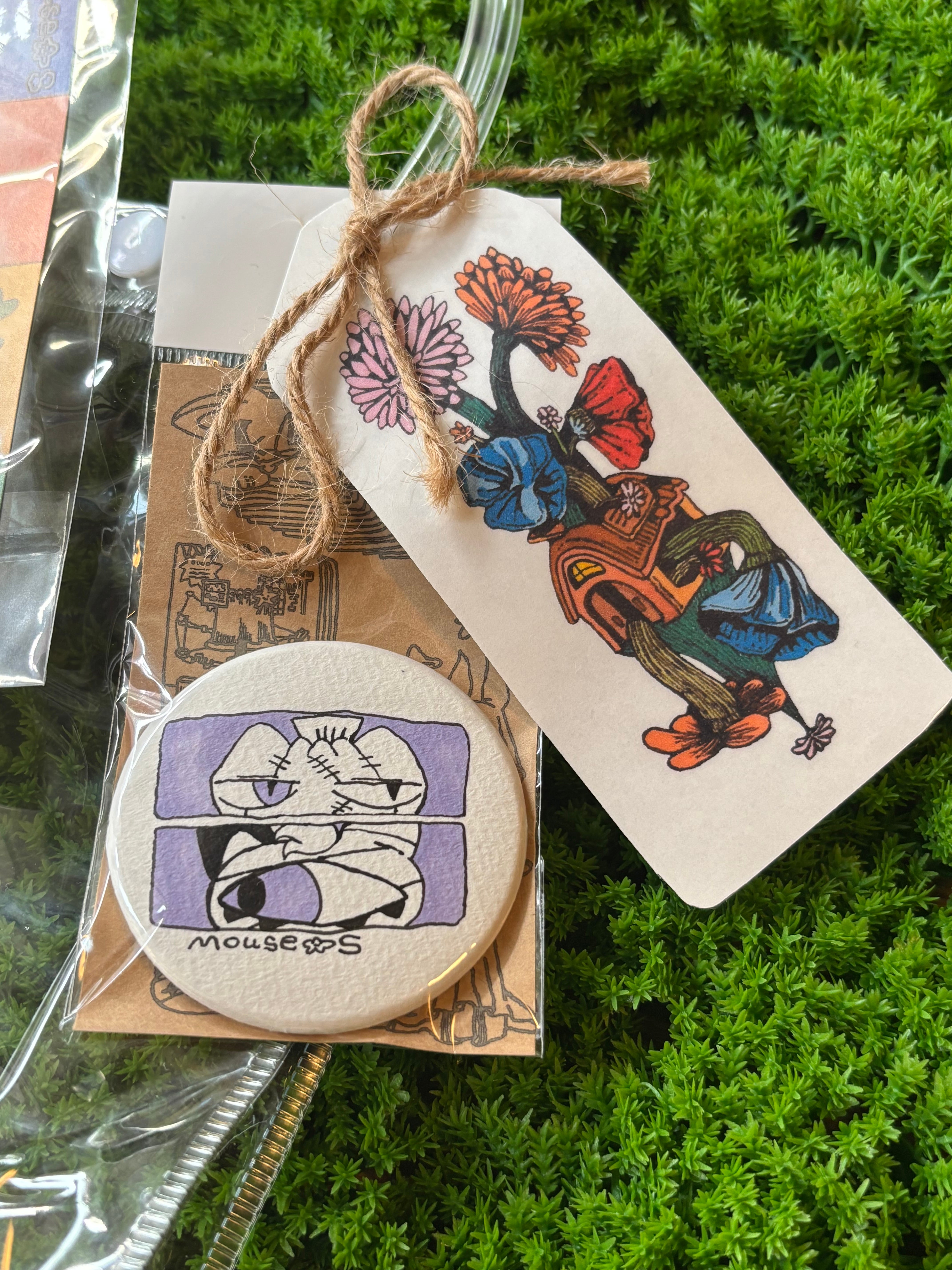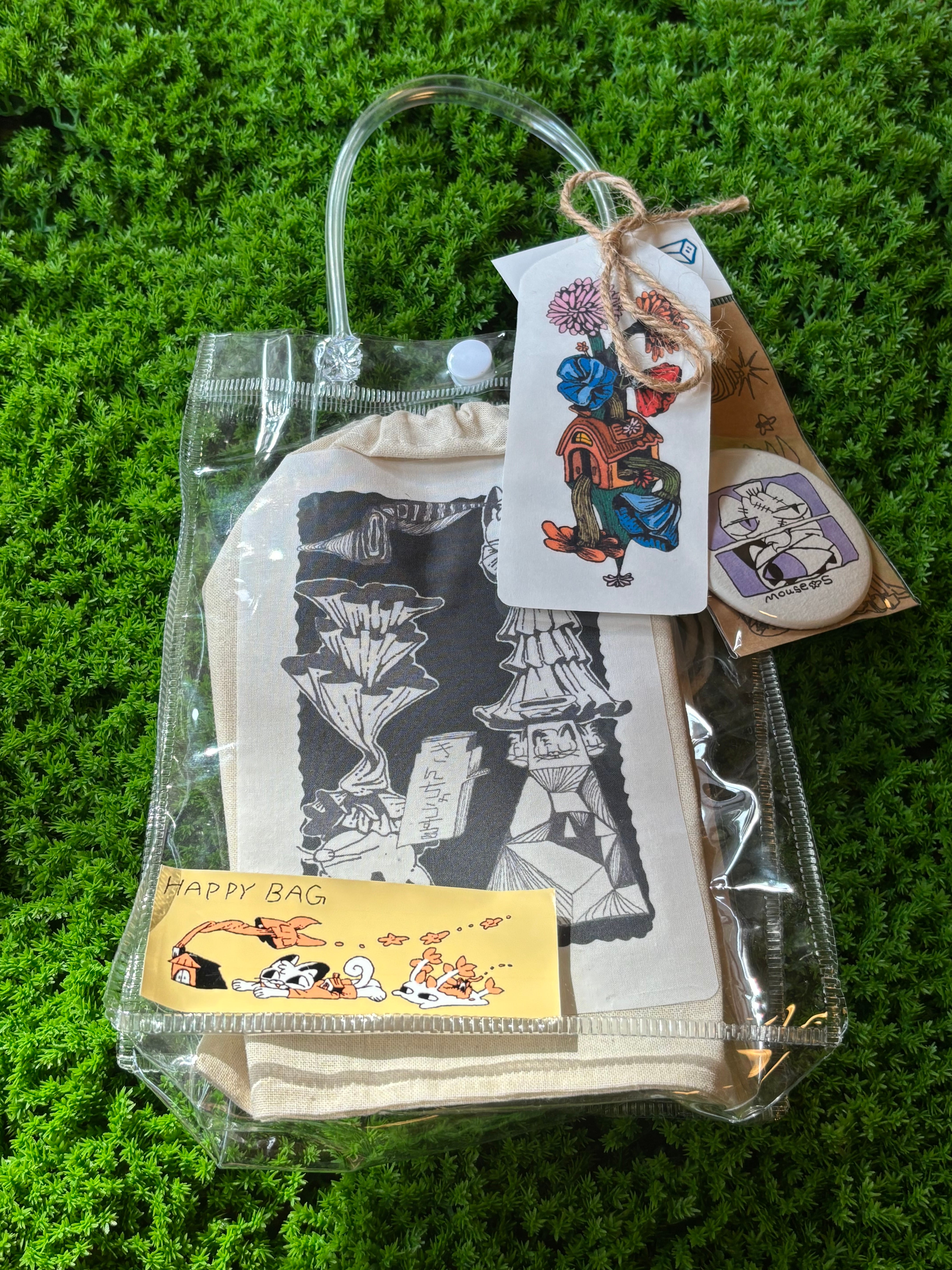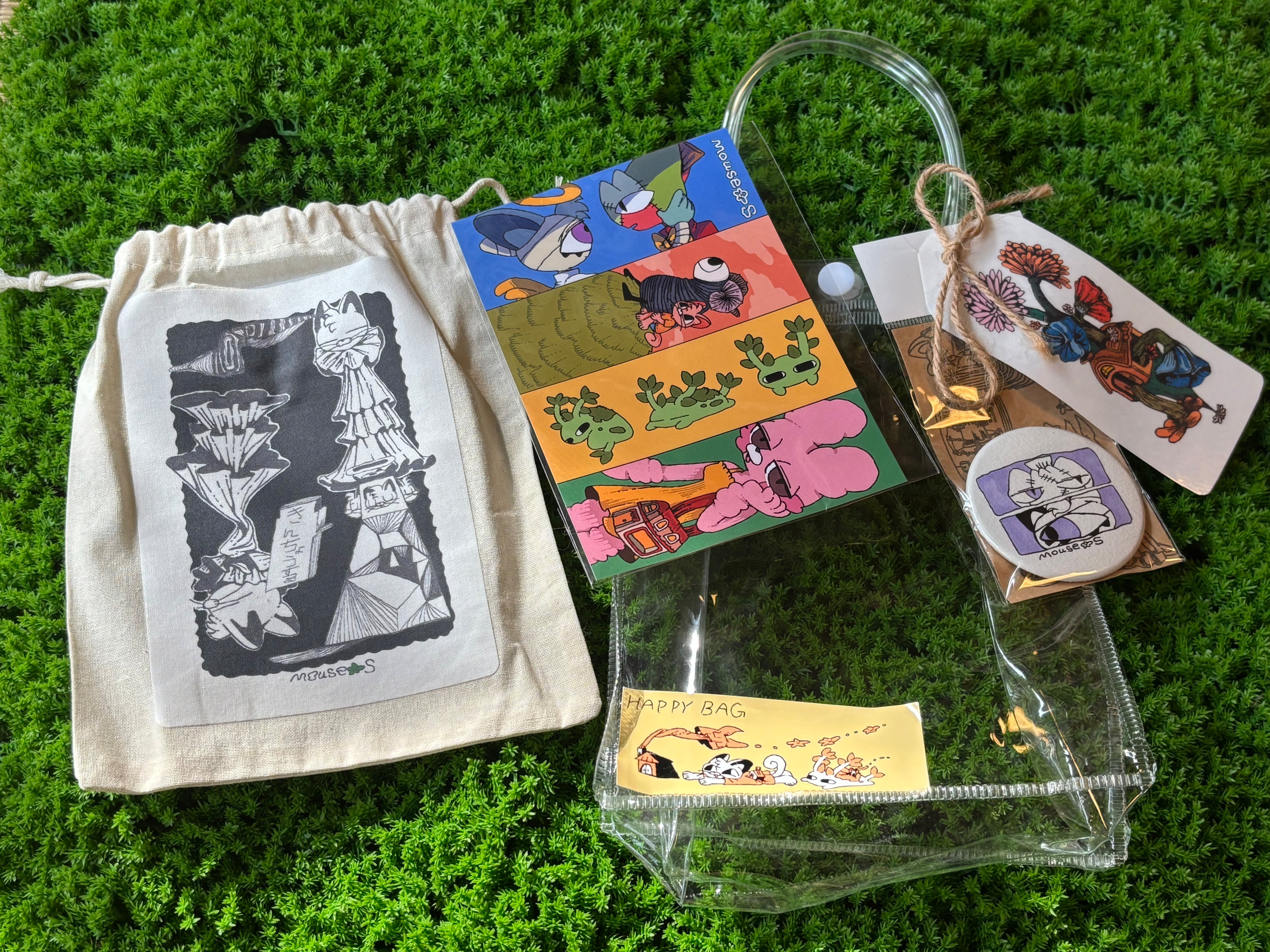 原画 缶バッチ・プリントポーチ・ポストカードがセットになっています。