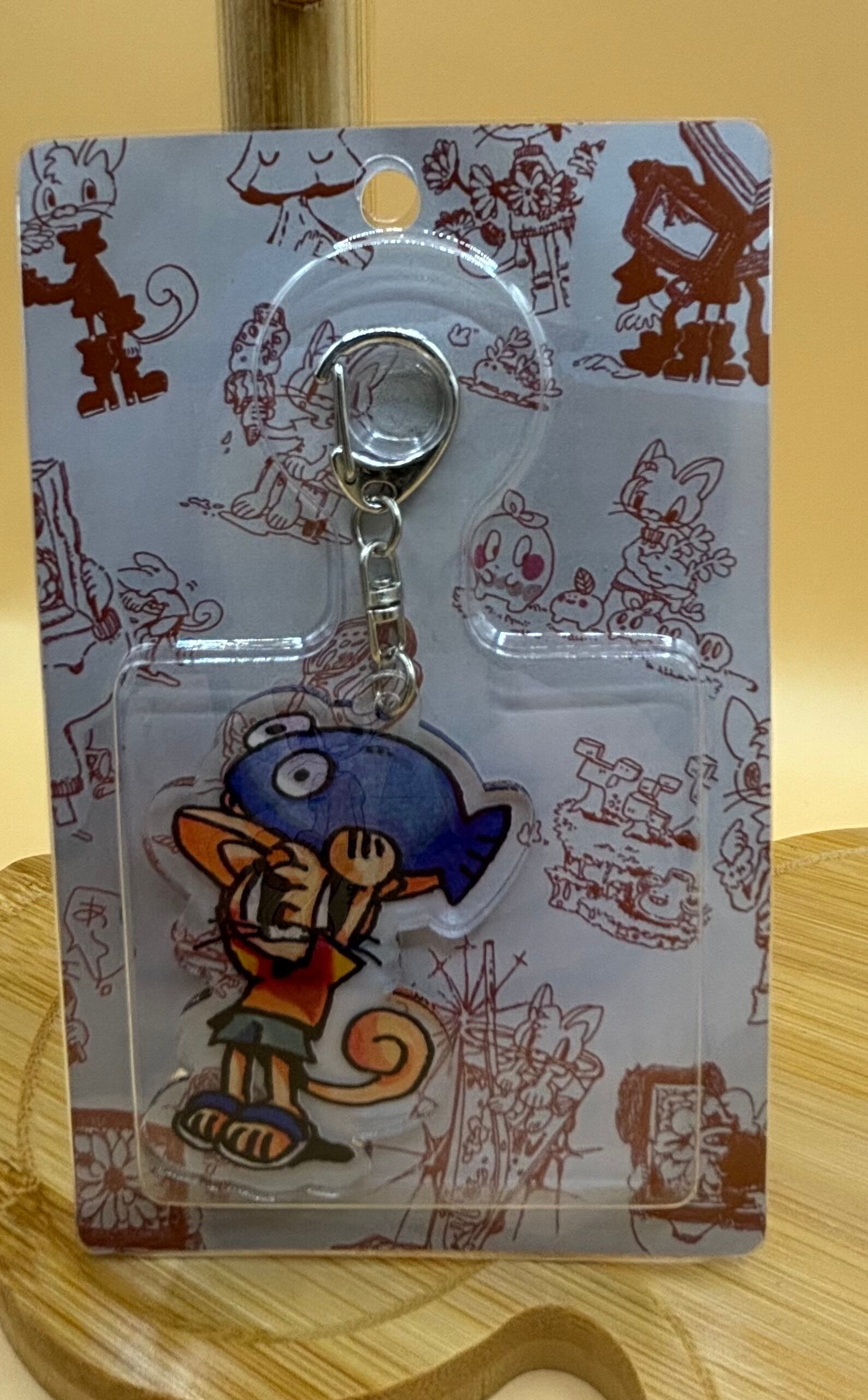 青いお魚を掲げる姿がキュートなキーホルダーです!